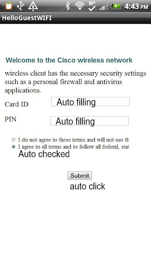 Overview: no need to type in complex username / password for some hotel, or company guest network/wifi hotspots. Most Hotels that requires a username/password, or just a email address,OR just one Accept Button / Checkbox